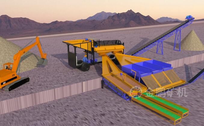 原礦通過礦用自卸車運輸到選金車礦倉,礦倉上設有格篩防止大塊礦石進入到分級洗礦篩對篩子造成危害,礦石在篩子內通過高壓水的沖洗使礦石、泥土、顆粒金分開。篩上產品通過皮帶運輸機直接運輸到廢料堆廠,篩下產品經過鼓動溜槽先進行富集,然后再自流至固定溜槽進一步回收有價金,通過兩次選別作業顆粒金的回收率可高達70%以上。我公司生產的移動式砂金選礦車解決了原來固定式運輸成本高的弊病更適合旱地選金。